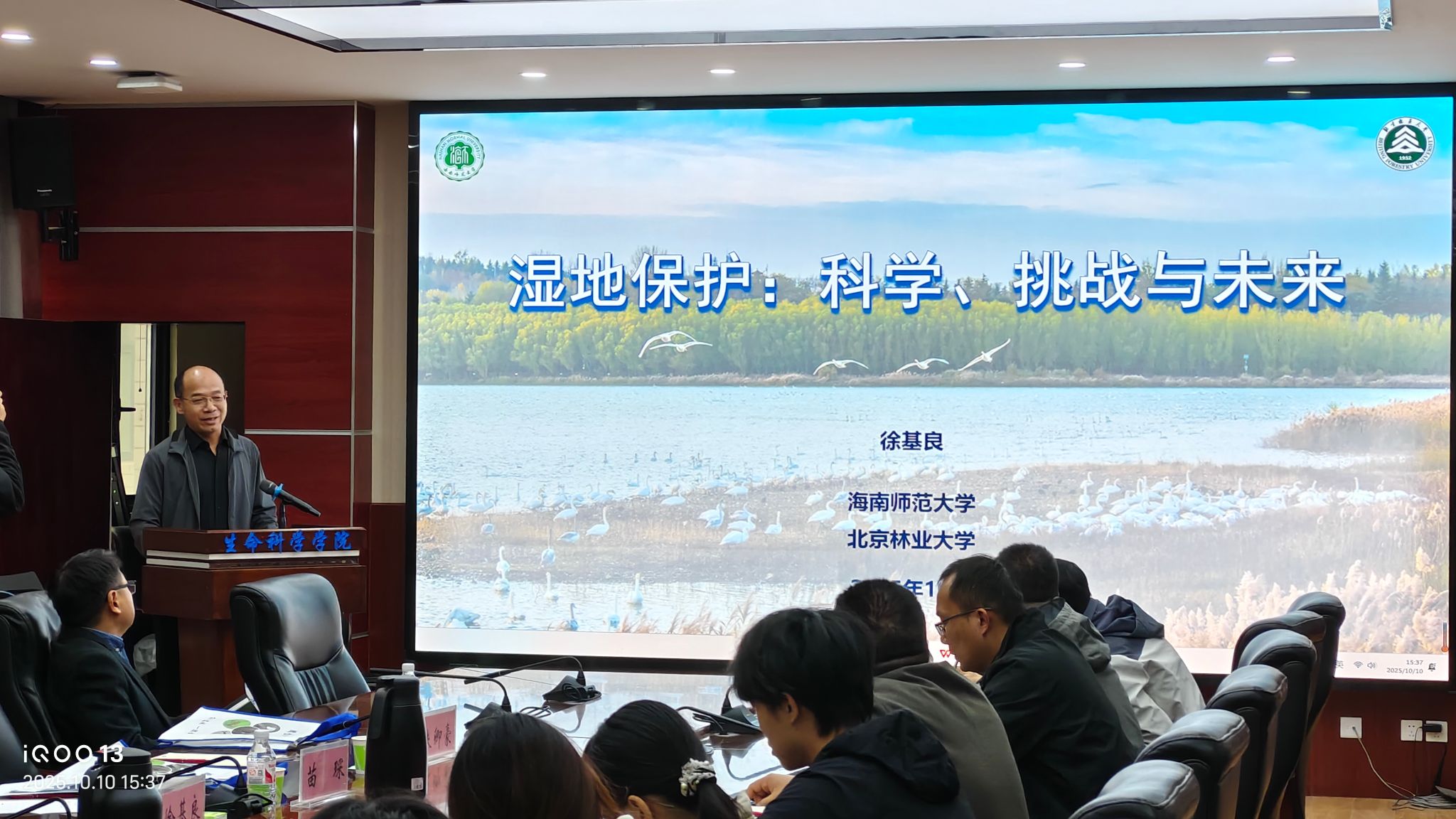 报告会上,徐基良围绕湿地的现状、面临的挑战与可预见的未来三个核心板块展开。他深入讲解了湿地的定义、分类及其作为“生命支持系统”的根本价值与重要作用,通过聚焦于当前湿地生态所面临的危机,通过翔实的数据与案例,深刻揭示了人类活动与环境变化带来的严峻挑战。通过对比破环前后修复湿地环境所需资源,强调了“保护优于修复”的核心理念,系统梳理了《湿地公约》及我国相关政策法规的演进与发展,展现了我国在保护环境理念和实际行动上作出的贡献。