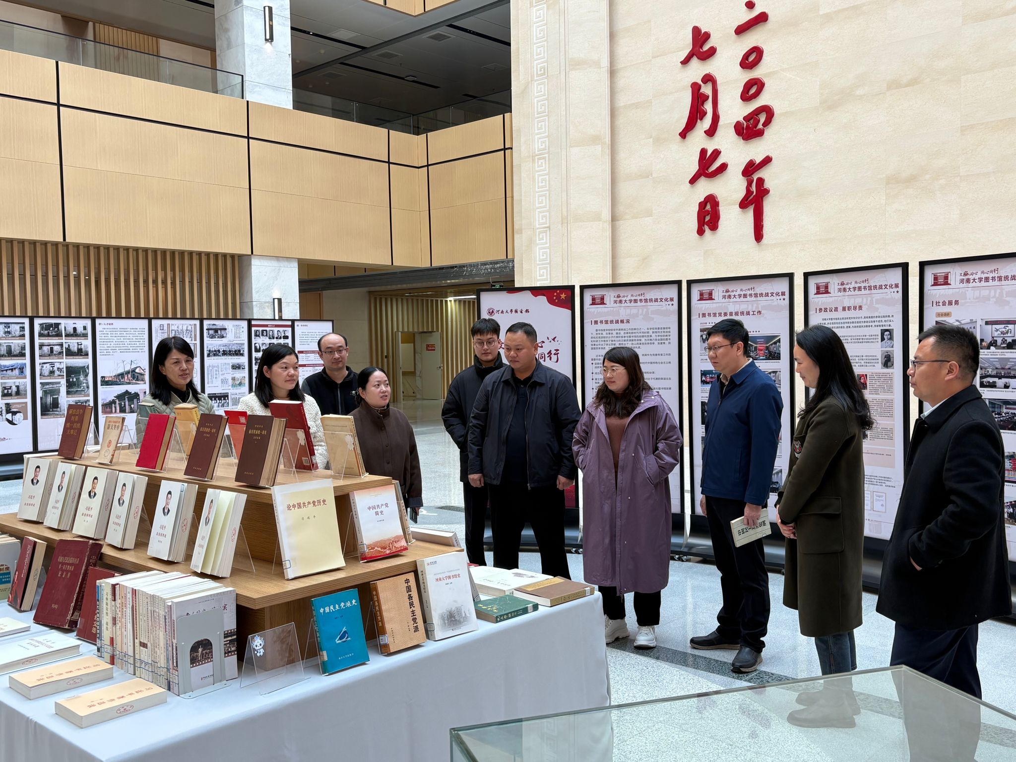 理论学习结束后,全体党员前往金明校区图书馆,参观了图书馆策划举办的“文脉润心 同心同行”——图书馆统战文化展。该展包括“统一战线主题书展”与“河南大学图书馆统战工作展”,在图书馆馆员、民盟河南大学委员会秘书长文洁的生动讲解下,党委统战部全体党员沿着历史的脉络,系统回顾了统一战线在中国革命、建设和改革事业中建立的丰功伟绩,学习了各个历史时期统战工作的宝贵经验与智慧。一幅幅珍贵的图片、一份份翔实的文献,让大家对统一战线凝聚人心、汇聚力量的政治优势有了更直观和深刻的感悟。
