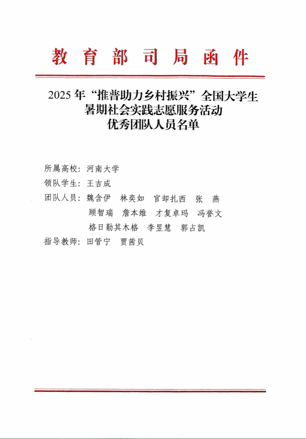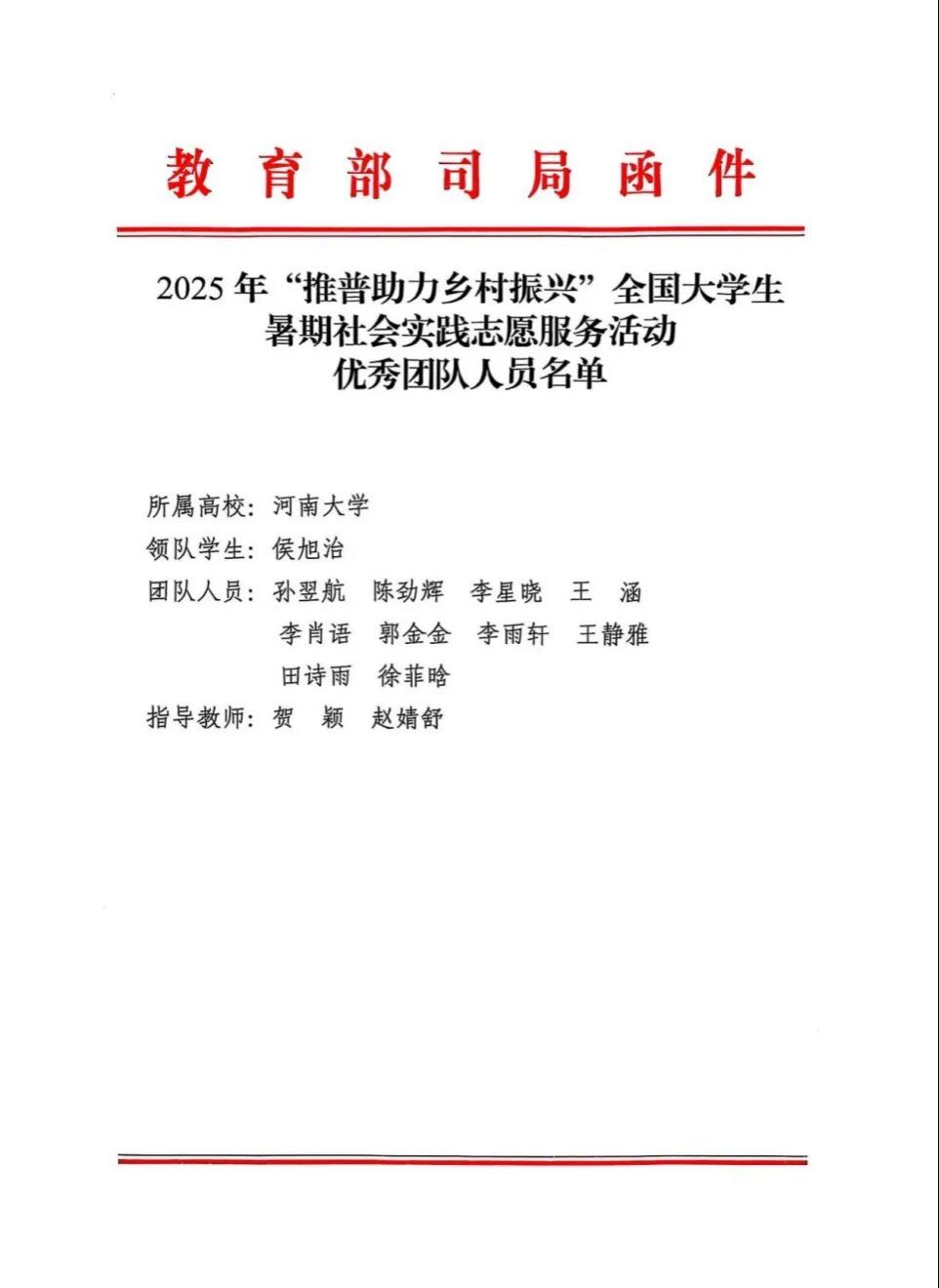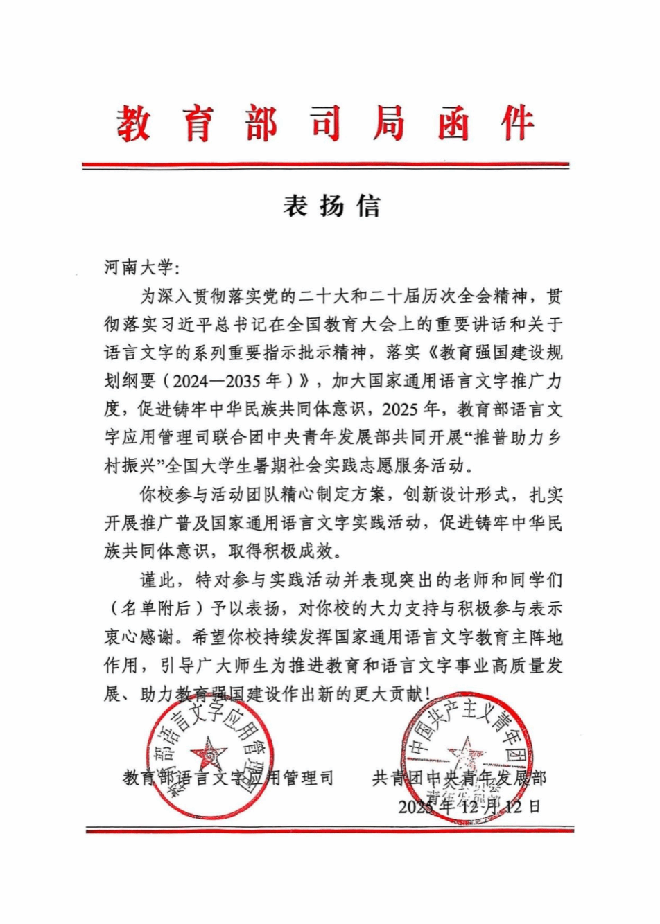 近日,由教育部、团中央共同举办的2025年“推普助力乡村振兴”全国大学生暑期社会实践志愿服务活动评优结果揭晓。河南大学收到教育部、团中央的表扬信,信中对我校师生在活动中的突出表现予以充分肯定,高度赞扬了我校在推广国家通用语言文字、助力乡村振兴、铸牢中华民族共同体意识等方面取得的积极成效。历史文化学院“语脉同心”推普实践团与欧亚国际学院“推普筑梦・语润略阳”推普实践团,从全国2000支参赛团队中脱颖而出,获评全国“优秀团队”称号。